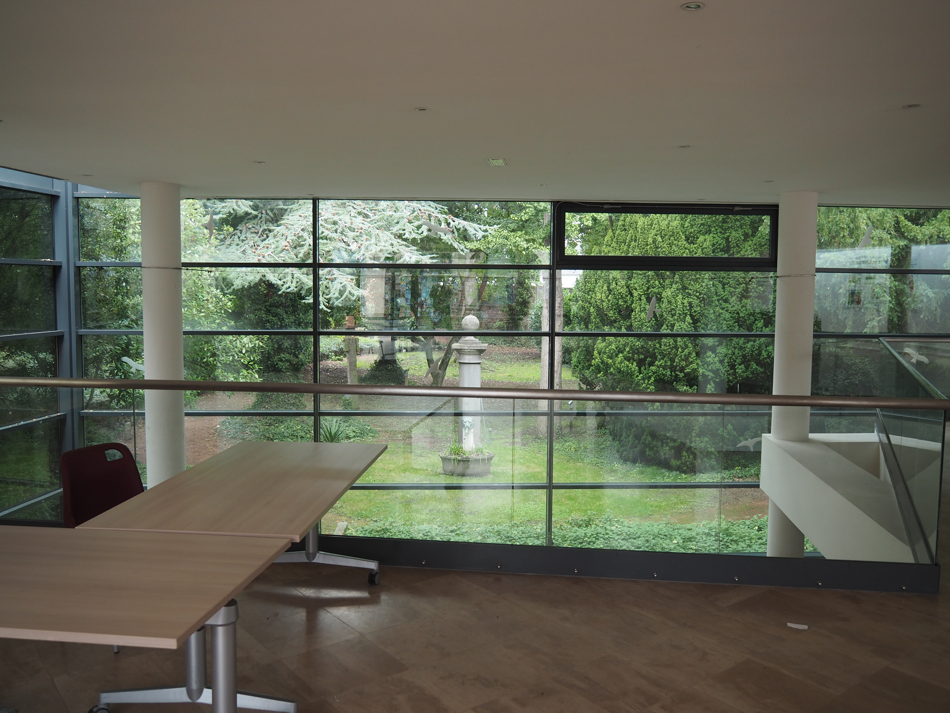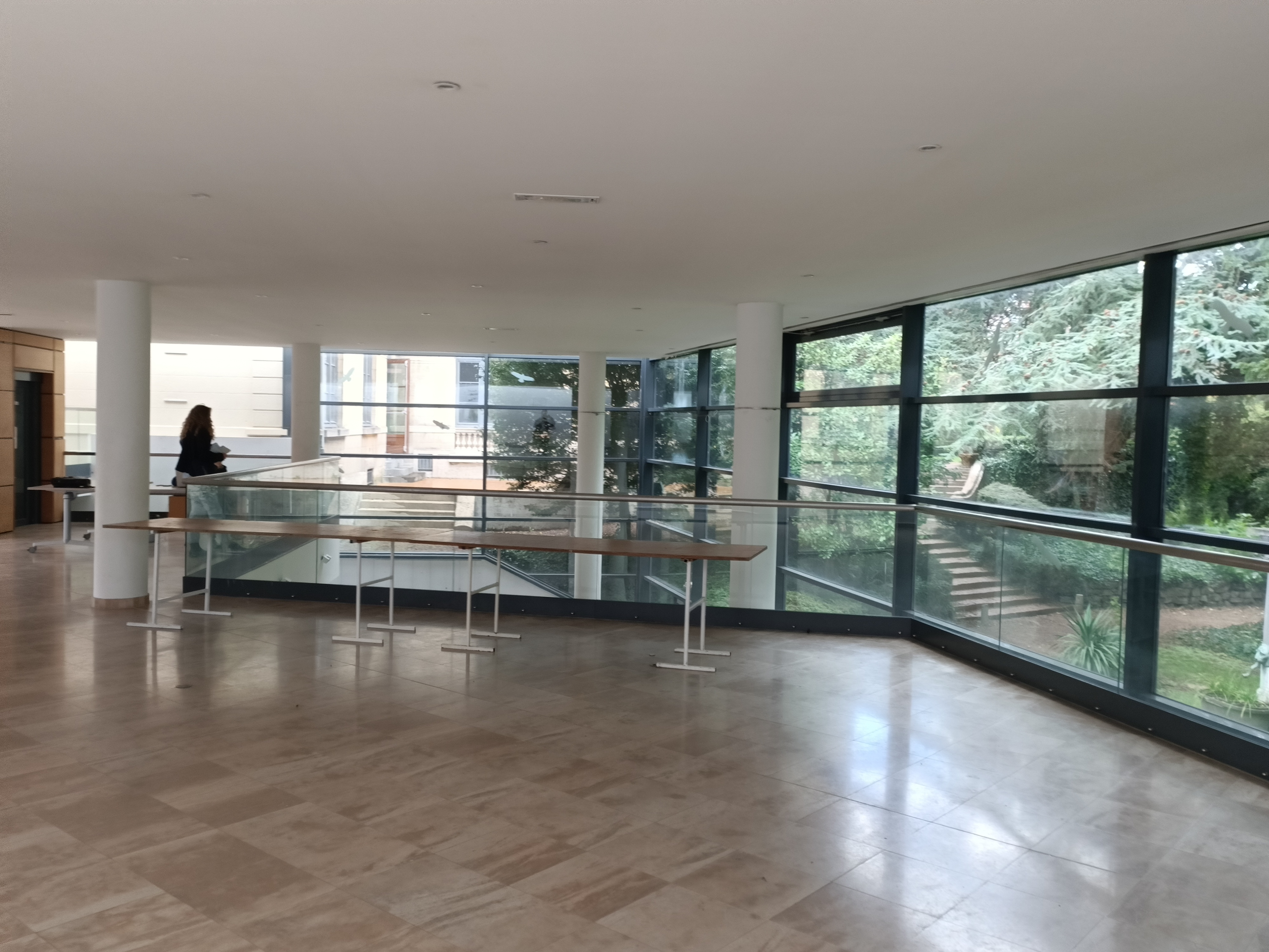 1. OUVERTURE RADICALE Une façade vitrée remplace le mur opaque de clôture, créant une porosité visuelle et fonctionnelle entre la rue et la médiathèque. La double hauteur élargit et prolonge la transparence vers le jardin en contrebas. Cette transparence dématérialise la limite entre intérieur et extérieur, tout en préservant l’intimité par des filtres vitrés.