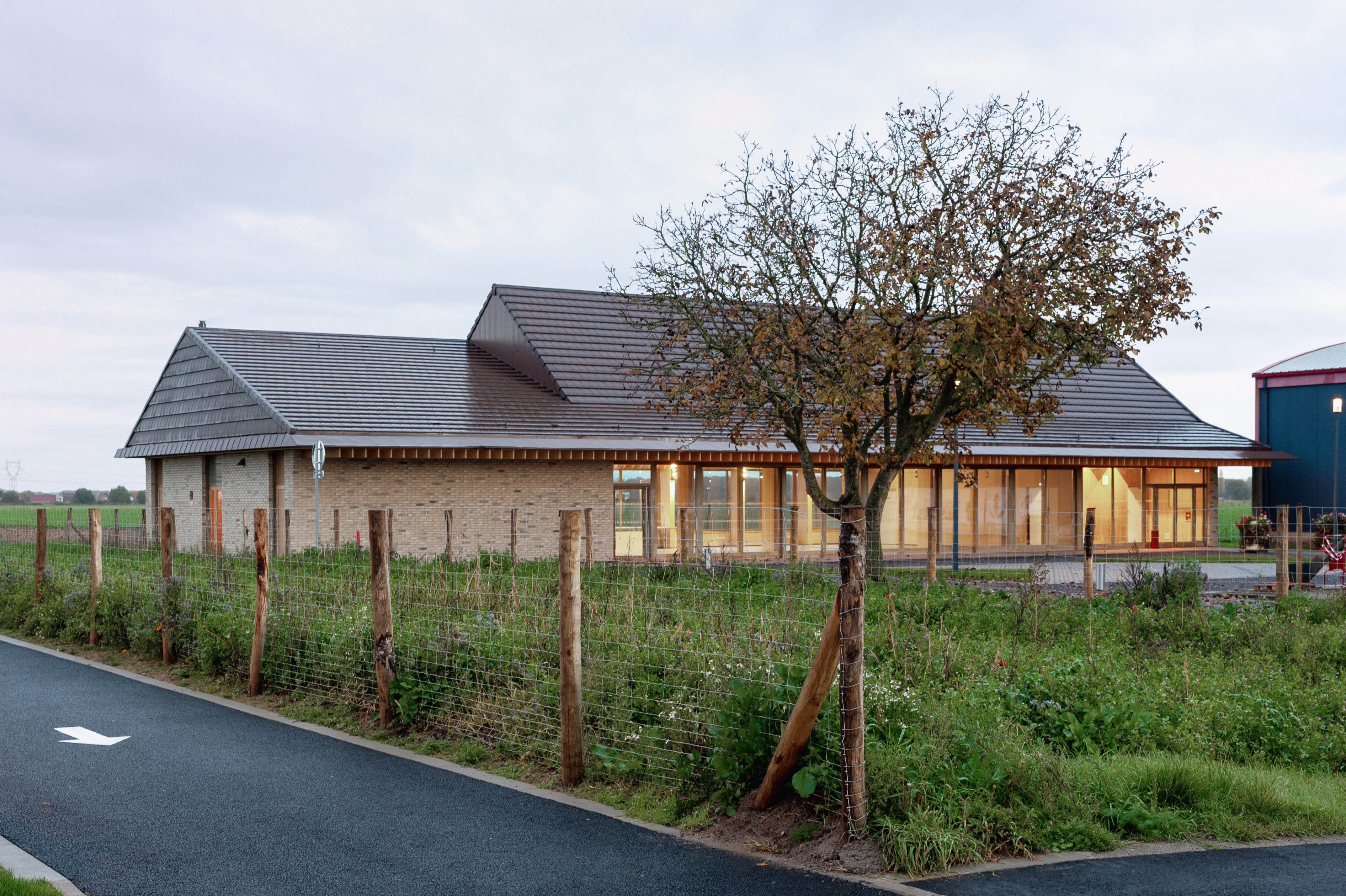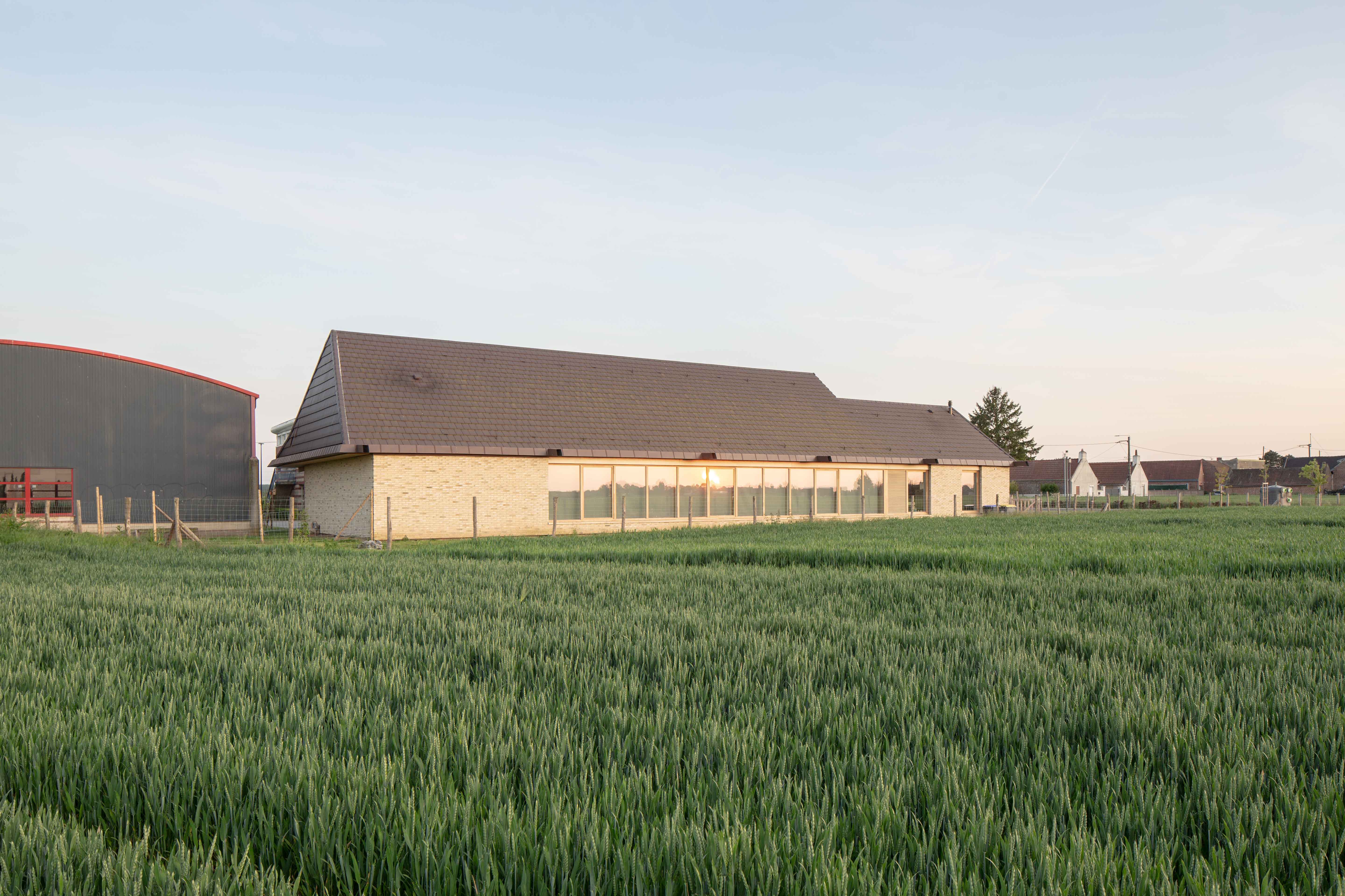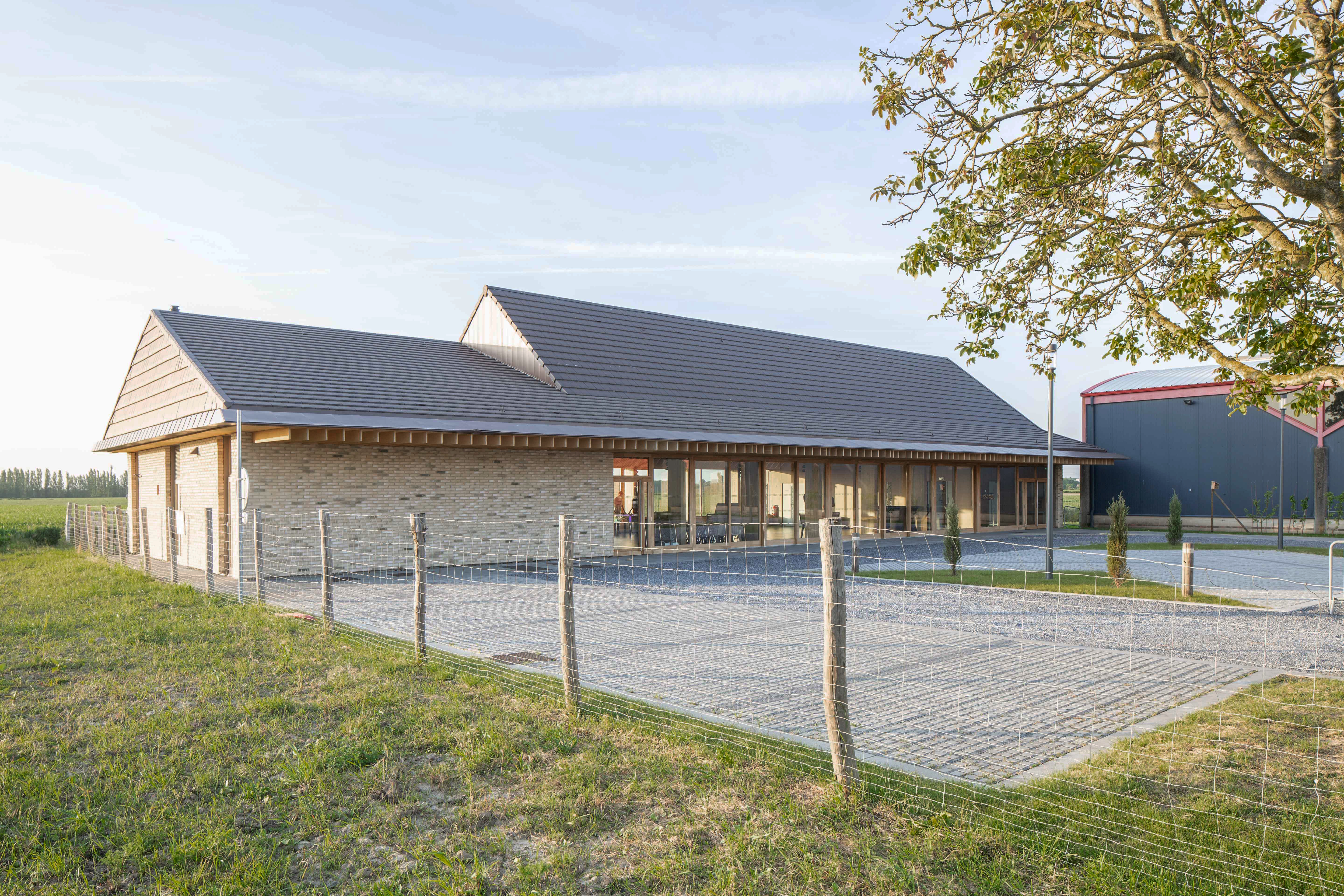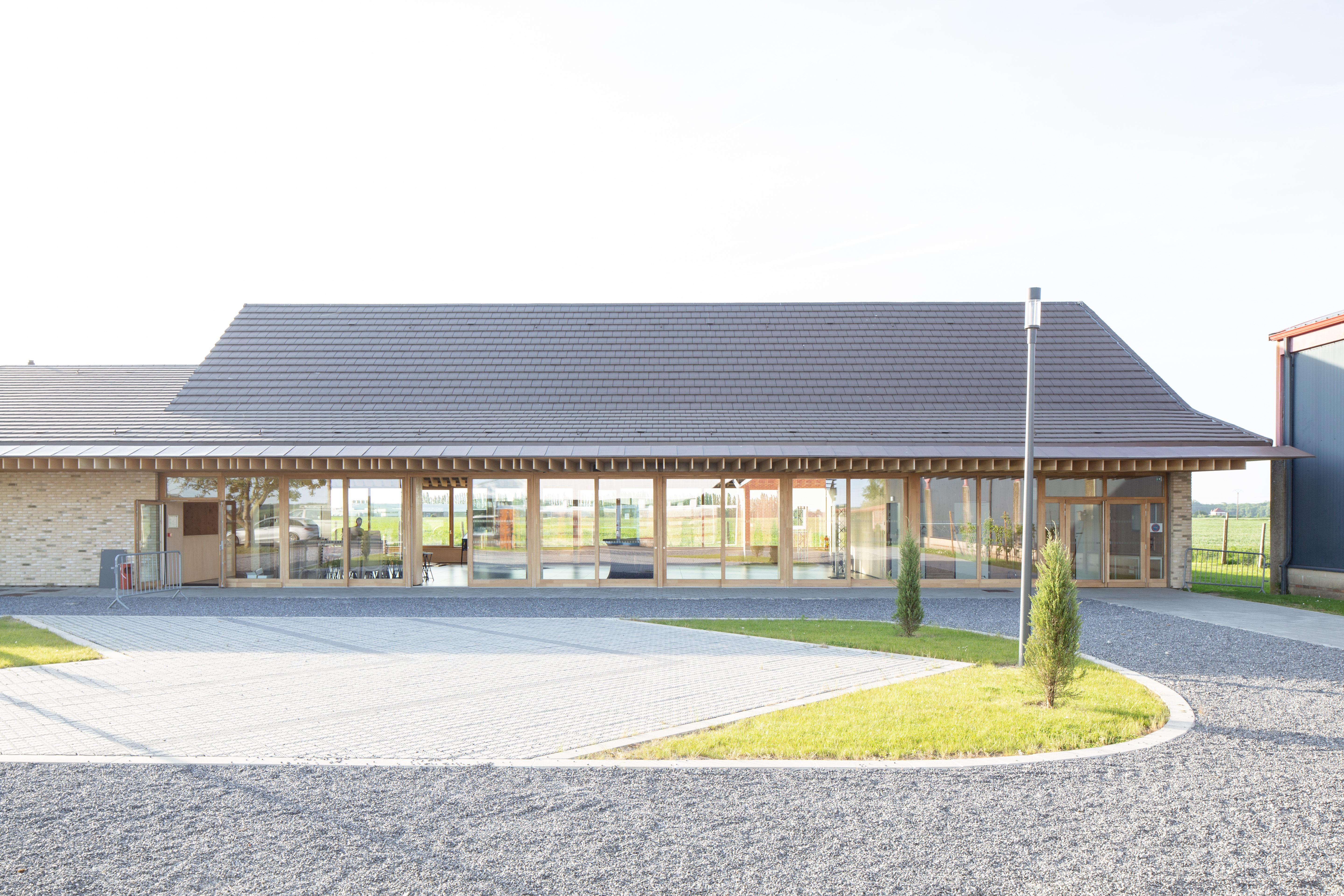Grange Conçue à l’image d’une longue grange de 37,90 m, la grande salle est traversante. Elle s’ouvre visuellement au nord vers le grand paysage, l’horizon des champs. Au Sud, elle s’ouvre physiquement par une façade protégée par un auvent et entièrement escamotable via des portes accordéon sur un parvis.
