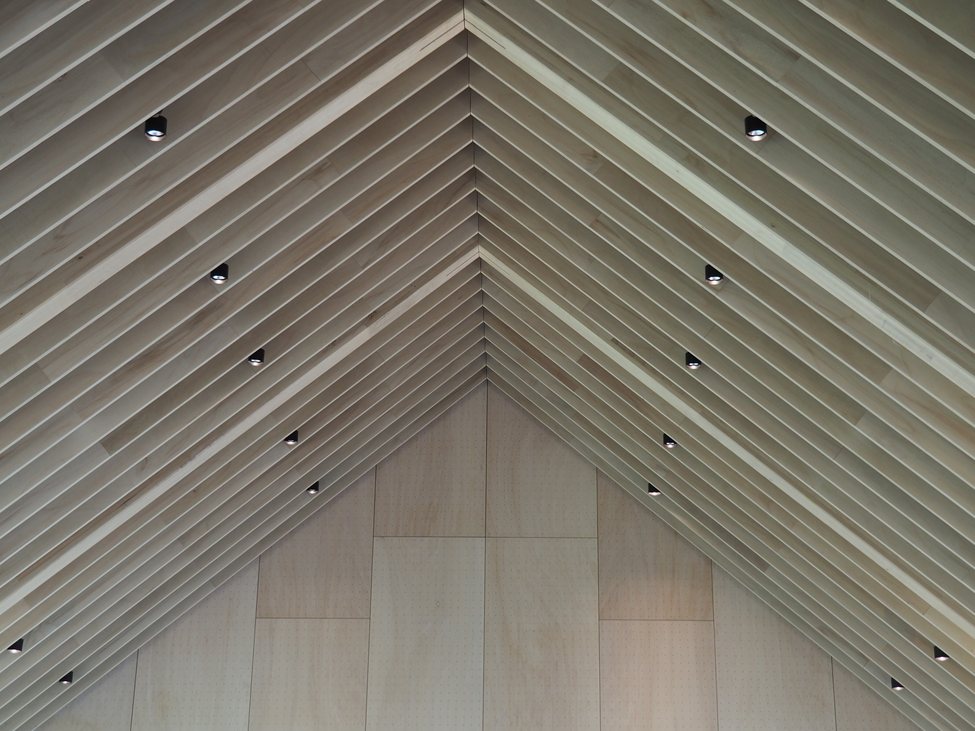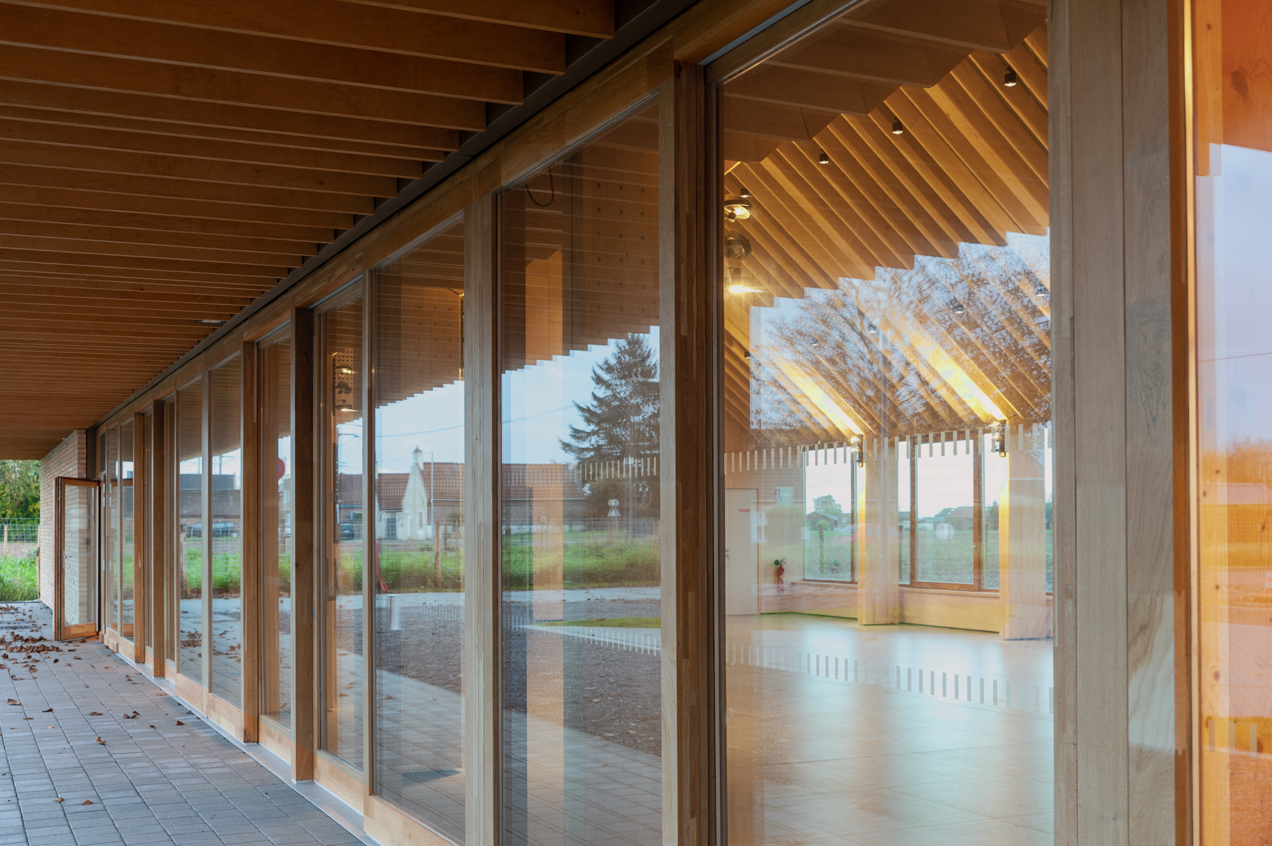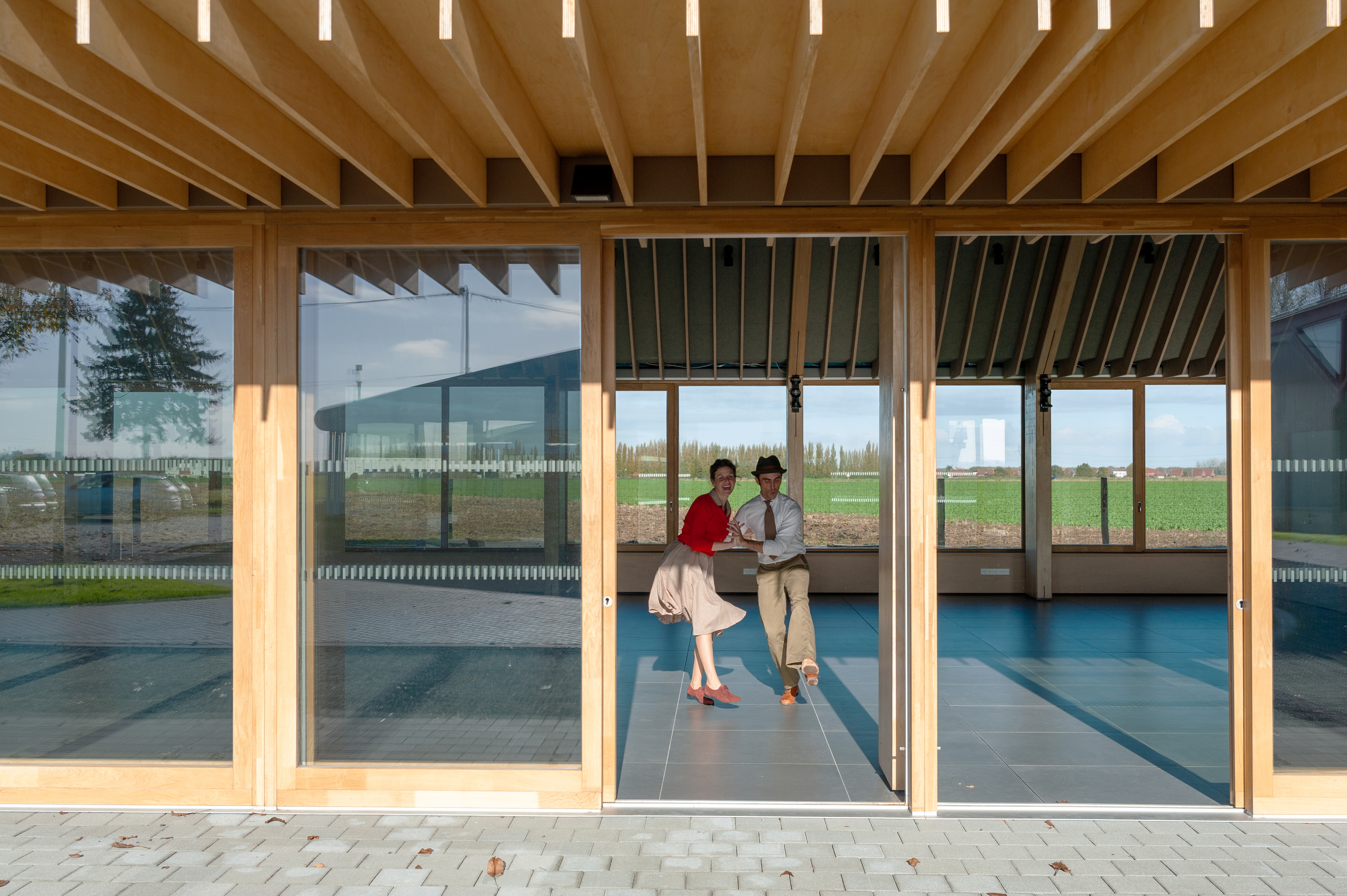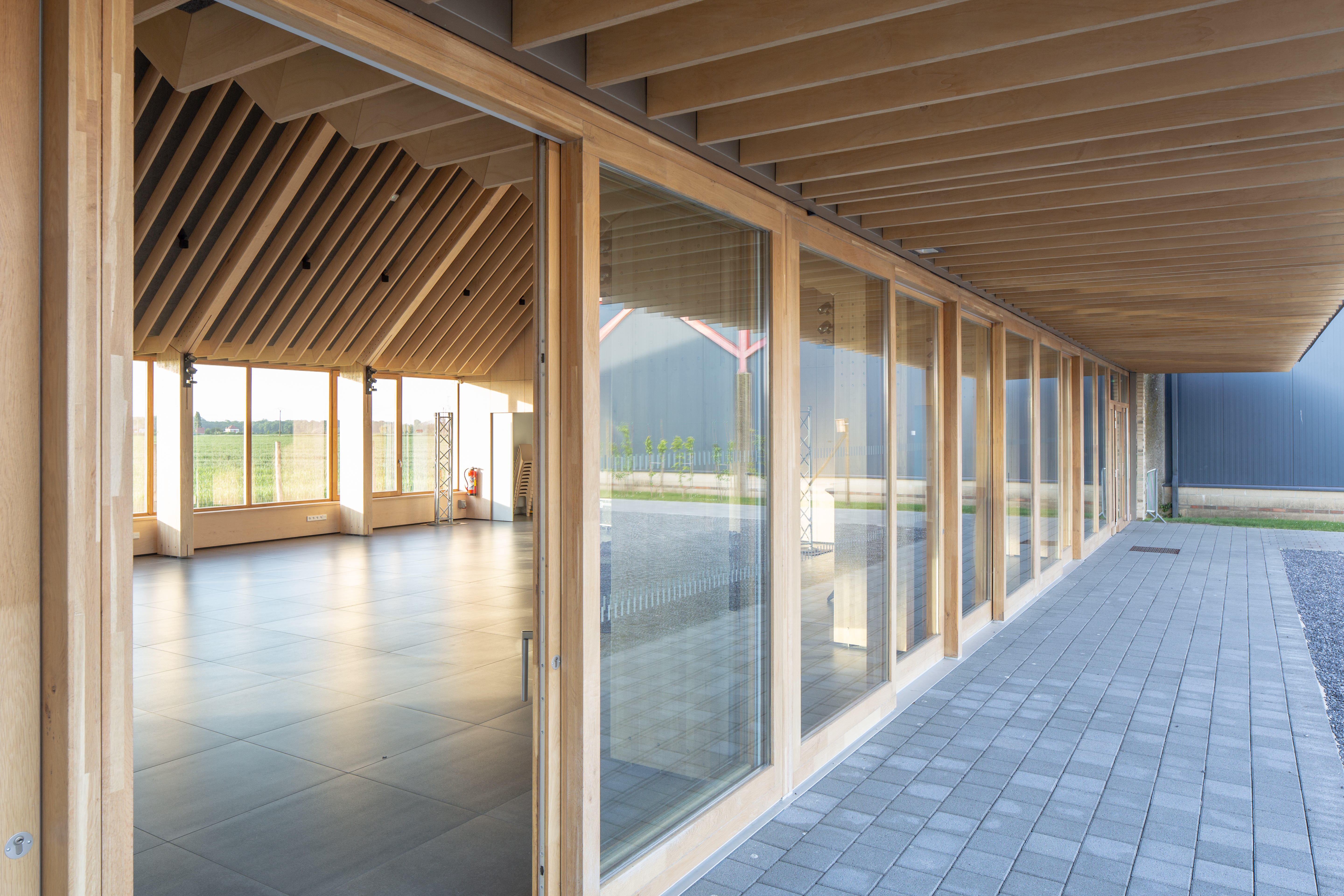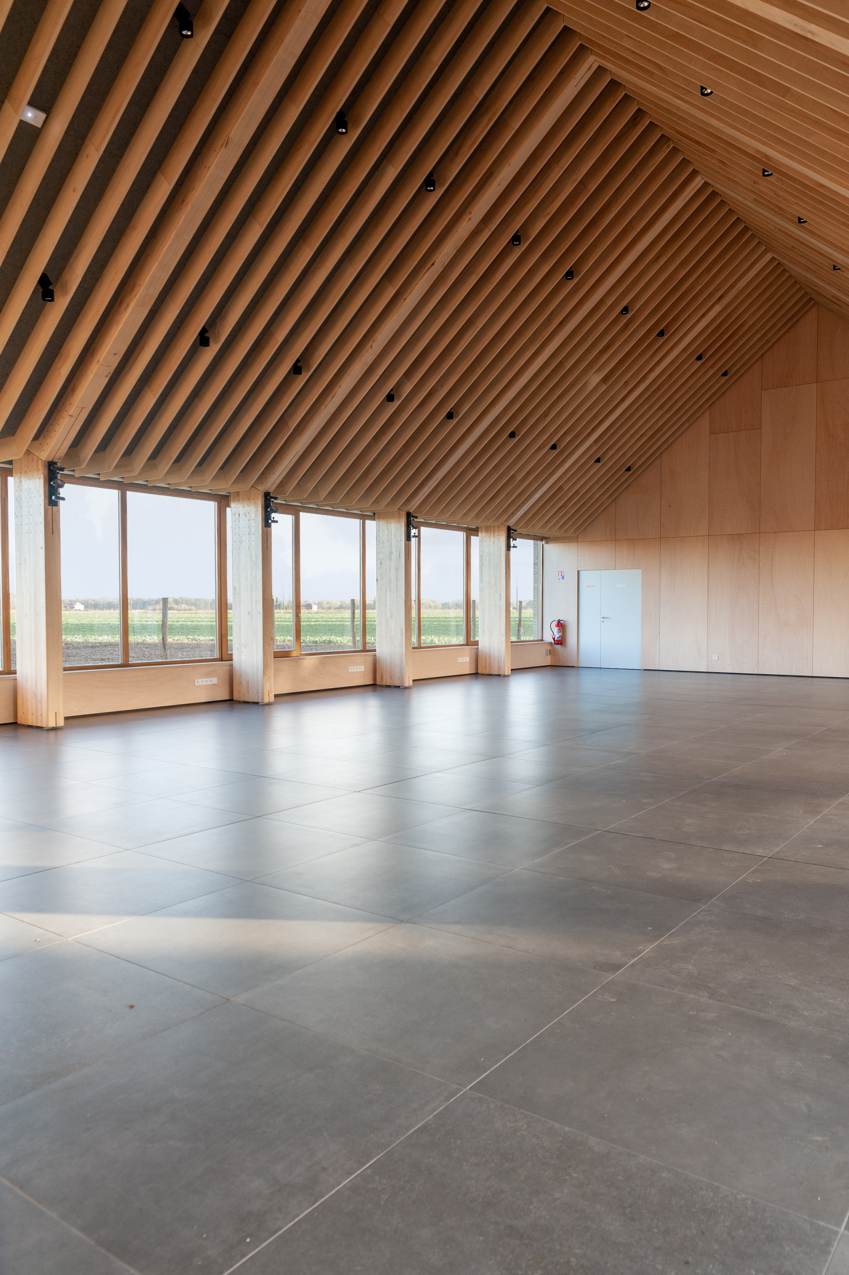 Structure bois La salle polyvalente profite de la double pente de la toiture. Elle dispose d’un plafond bois pour gérer l’acoustique et intégrer architecturalement les organes de traitement d’air et d’éclairage. La forme de ce plafond compose un paysage intérieur jouant de la sous-pente de la toiture l’équipement construit en structure bois apparente.