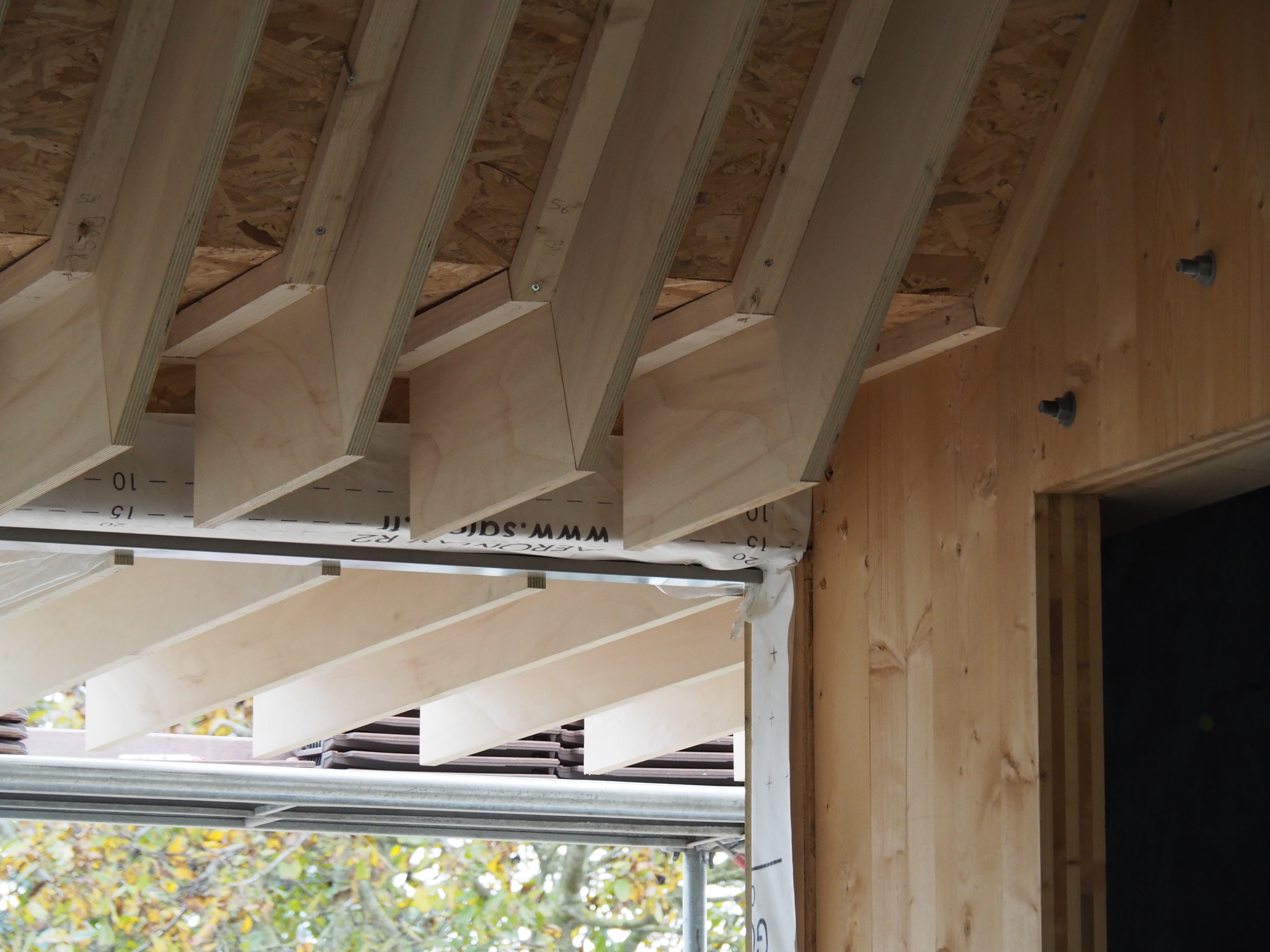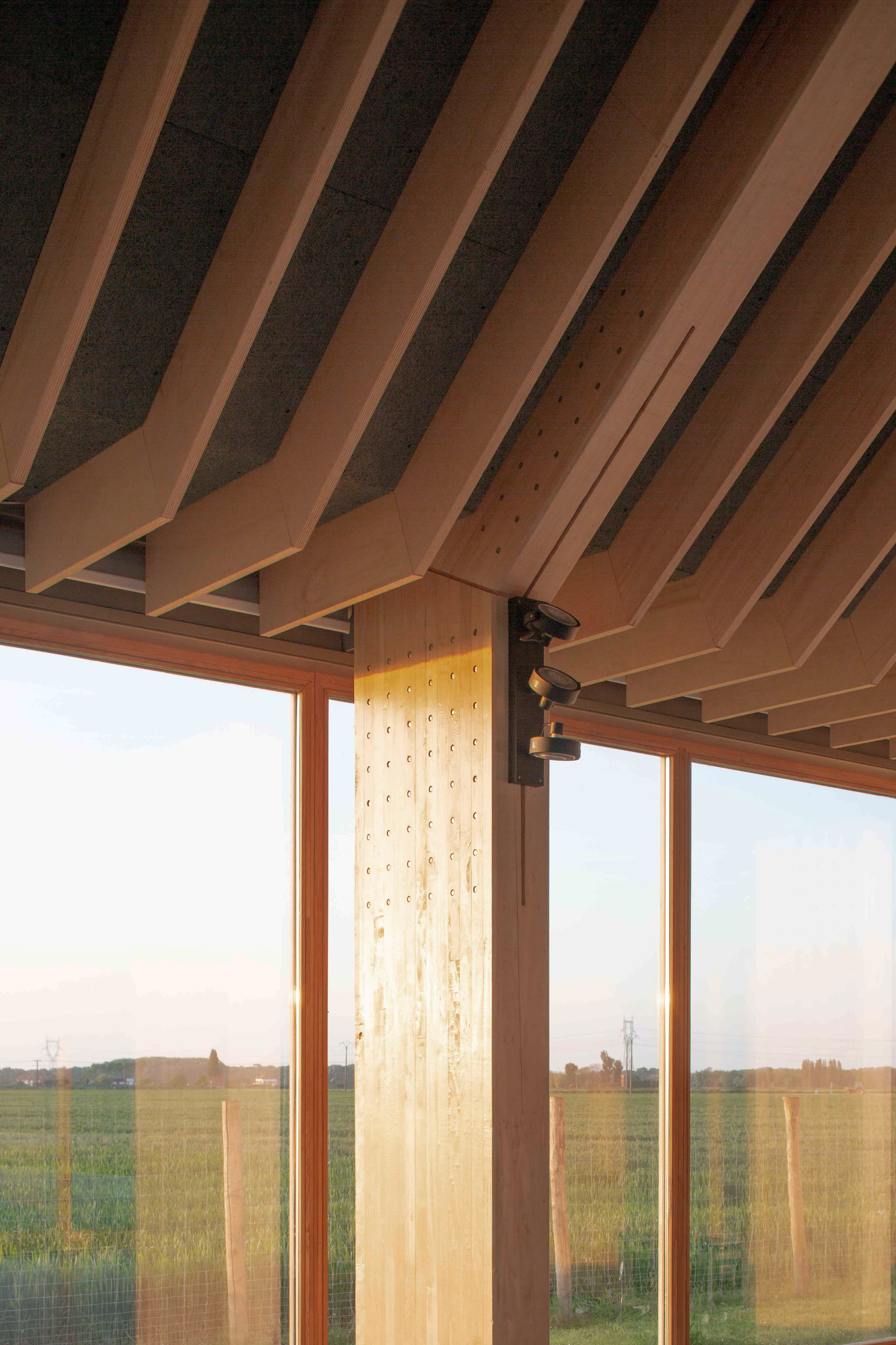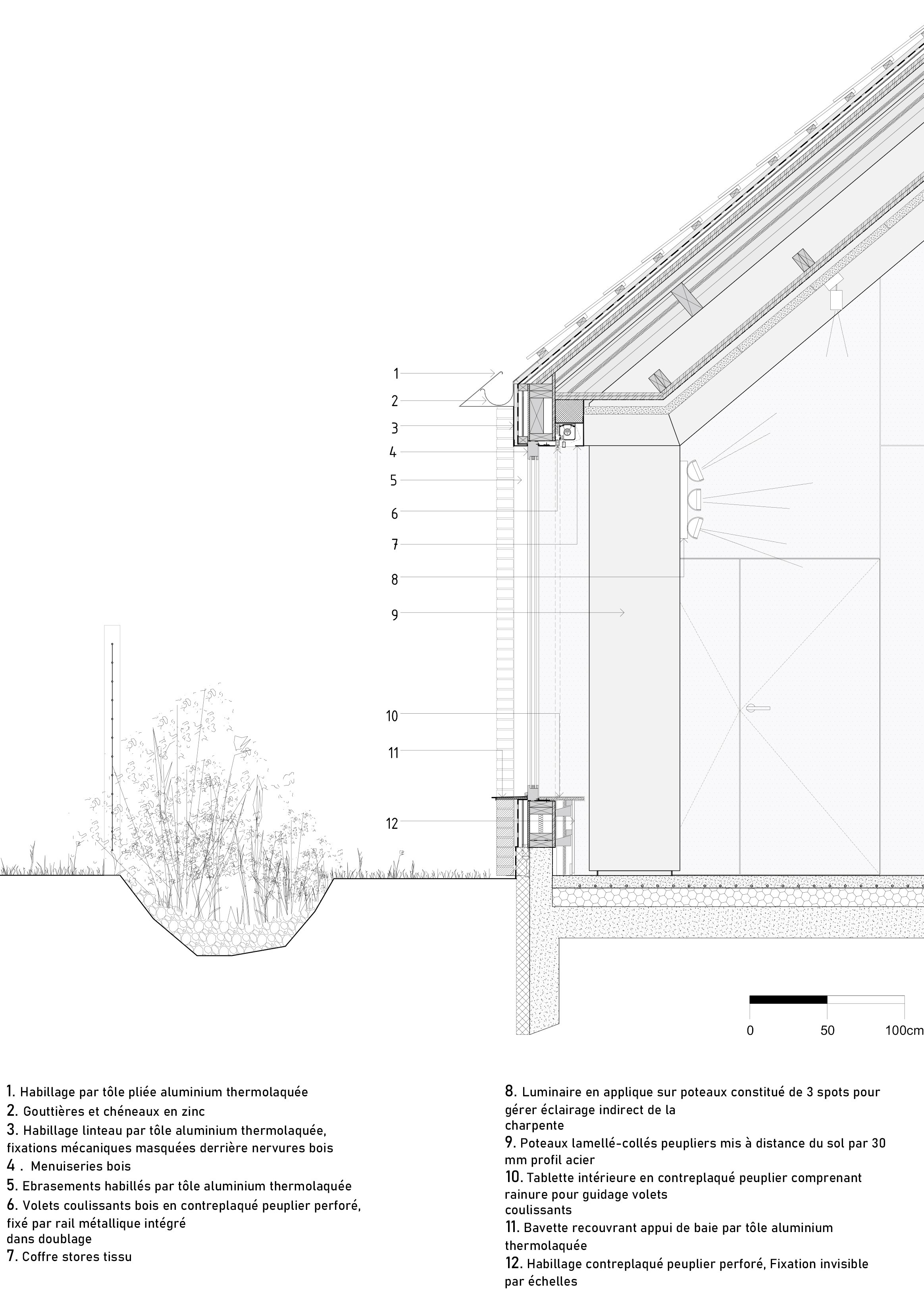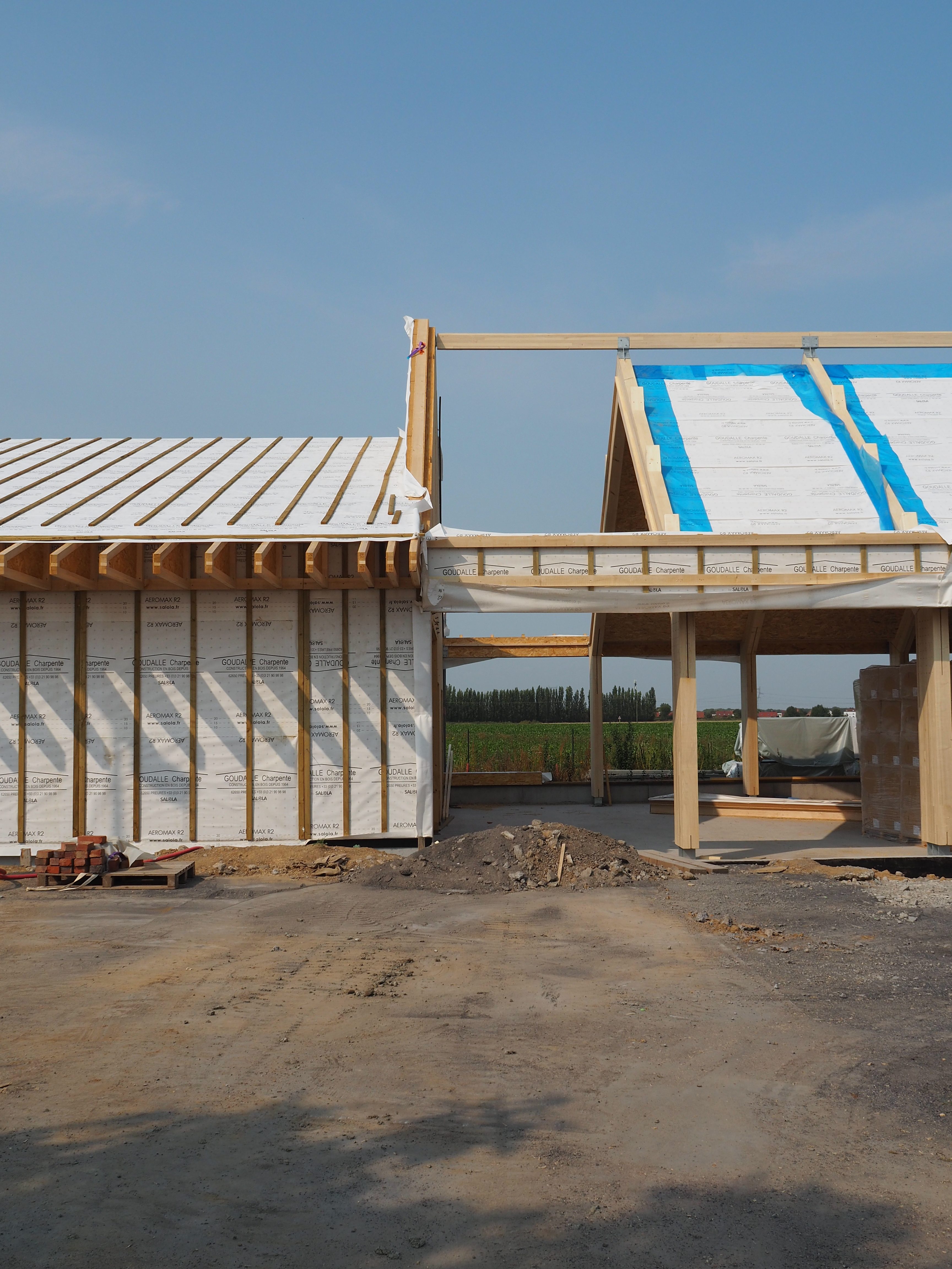 Démarche Frugale Une fois lauréat du concours, nous avons initié la possibilité de modifier le projet afin d’intégrer une démarche plus vertueuse. La présence d’Ingébois spécialiste bois a permis de modifier la matérialité pour entrer dans le dispositif de filière bois local des Hauts-de-France avec Fibois. Le projet est passé d’une structure en parpaing avec une charpente bois, à un projet en ossature bois. La structure (ossature des murs et charpente) est en lamellé collé peuplier régional, les menuiseries extérieures sont en chêne régional, et le cloisonnement en CLT (non régional). Les isolants sont à 80 % biosourcés, principalement issus de fibres de bois.